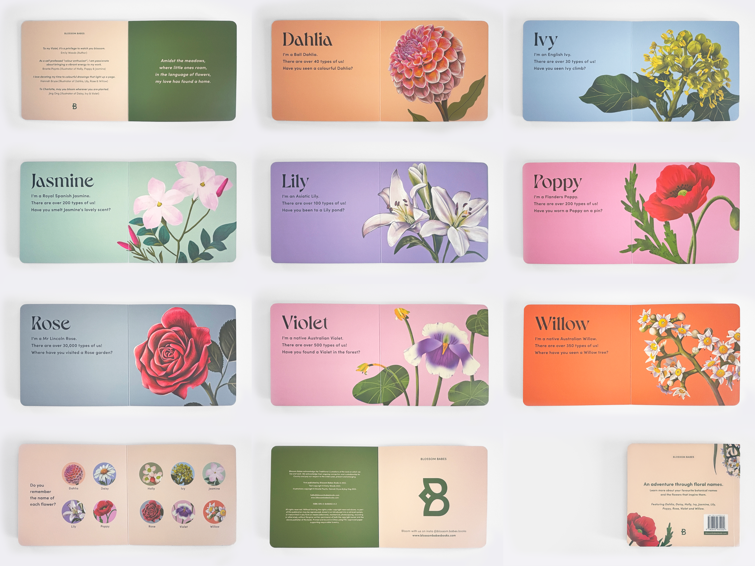 This is a personal project, inspired by my daughter, Violet. In 2022 I was hiking in northern NSW and came across a large group of native Violets. It was a real pleasure to show my little girl the flower that shares her name. It sparked a thought— what if other bubs named after flowers could have this experience? This inspired the creation of Blossom Babes, a 28-page board book created by me and brought to life through the talents of three incredible illustrators, who also happen to be my good friends.